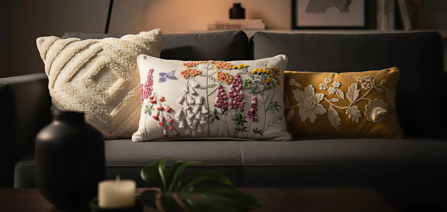 In a world of fast décor, we honour lasting quality—creating pieces that soften, settle, and grow more exquisite with time. Each design is imagined with intention, crafted to feel uniquely yours, and refined to bring a quiet, signature presence into your home. Our proprietary artistry, original patterns, and hand-crafted detailing set every piece apart. With high-performance sustainable textiles, durable natural fiber blends, and care methods that preserve shape and structure, our pieces are made to age beautifully. And with every purchase, you support skilled artisans whose heritage and craftsmanship deserve to thrive.