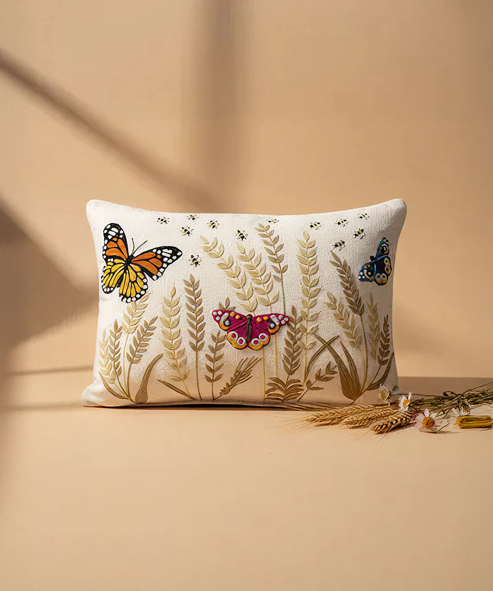 Bring a touch of nature’s poetry into your home with the Butterfly Meadow Cushion Covers. Crafted from 100% pure cotton, this elegant accent piece features intricate embroidery that captures the delicate dance of three vibrant butterflies—orange, pink, and blue—fluttering among golden stalks of wheat. Scattered bees add whimsical charm, making each stitch a celebration of the outdoors.